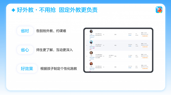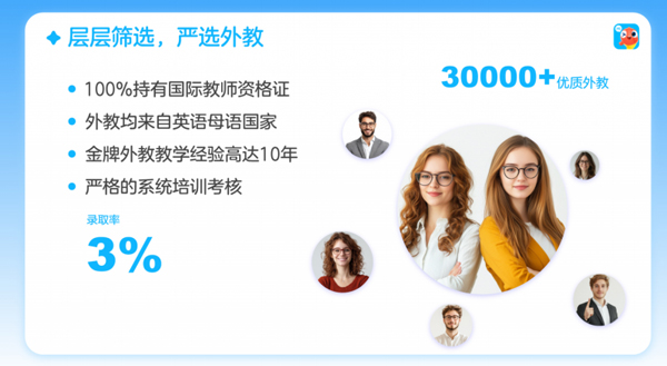 “双减” 前,少儿英语 1 对 1 外教赛道资本密集,多数机构沉迷于 “低价引流 + 融资扩张” 的短期模式,忽视教学本质。但伴鱼始终保持战略定力,以 “陪伴式个性化教育” 为核心,打造差异化竞争力。在 1 对 1 外教教学上,伴鱼建立行业最严苛的外教筛选体系,仅 3% 的优质外教能够入选,确保 100% 持有国际教师资格证且来自英语母语国家;更创新性推出 “固定外教” 模式,让师生建立长期稳定的教学关系,外教可根据孩子的性格特点、学习进度定制专属教学方案,大幅提升学习效果。这种对教学品质的极 致追求,让伴鱼在 “双减” 前便积累超 7000 万用户,覆盖 20 多个国家和地区,成功跻身第一梯队,为后续发展奠定坚实基础。